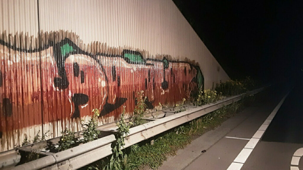 Langs de N261 tussen Waalwijk en Tilburg zijn geluidsschermen, schanskorven en onderdoorgangen ontsierd door hardnekkige graffiti. Om het verkeer zo min mogelijk te hinderen komen onze specialisten tijdens de nachtelijke uren in actie.